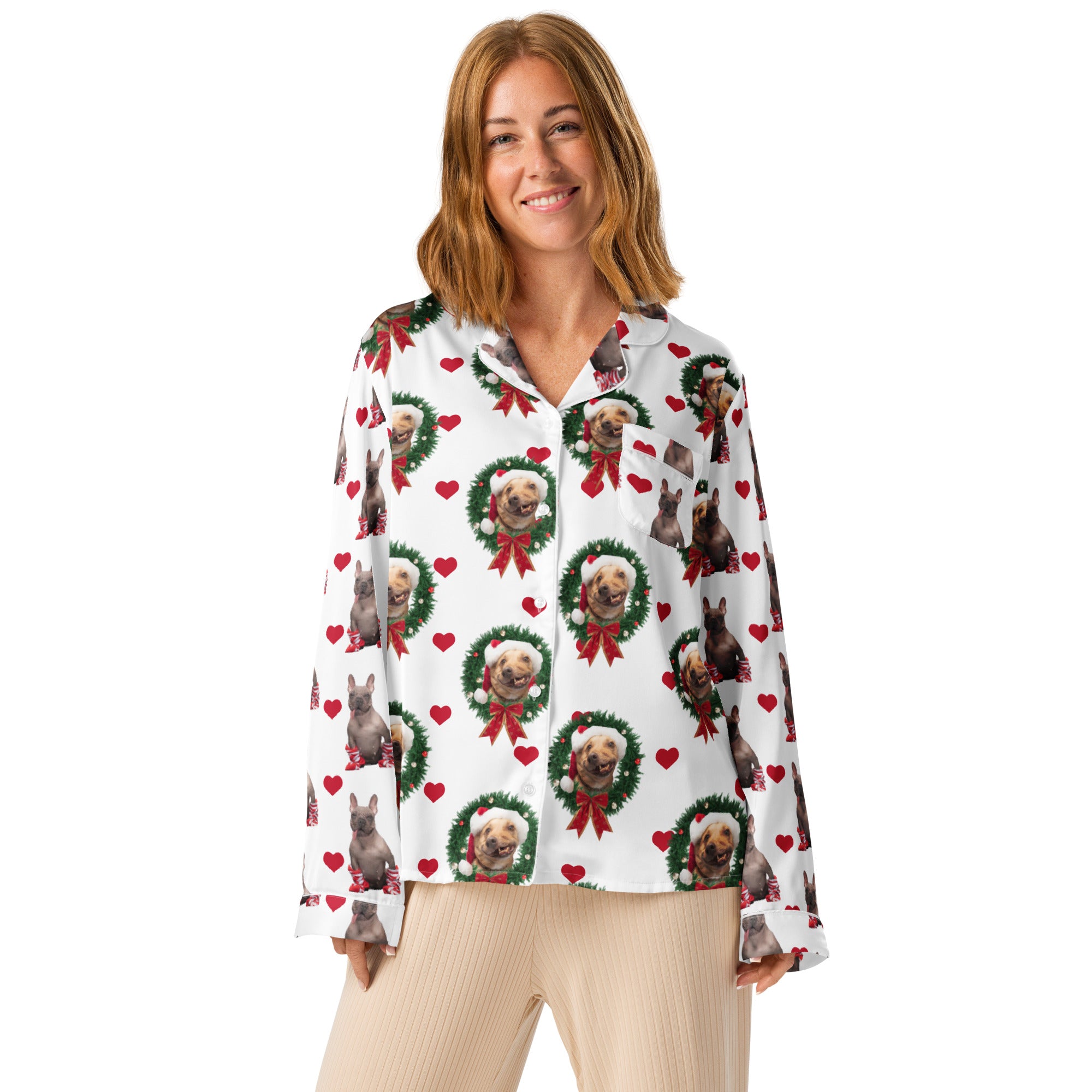 It's a very wonky holiday with Picasso the Original Wonky Faced Dog! Don't forget that all proceeds go toward our rescue partner, Luvable Dog Rescue. This silky pajama top is ideal for a cozy day when you want to feel both comfortable and elegant. It features a relaxed fit, chest pocket, and elegant piping detail.