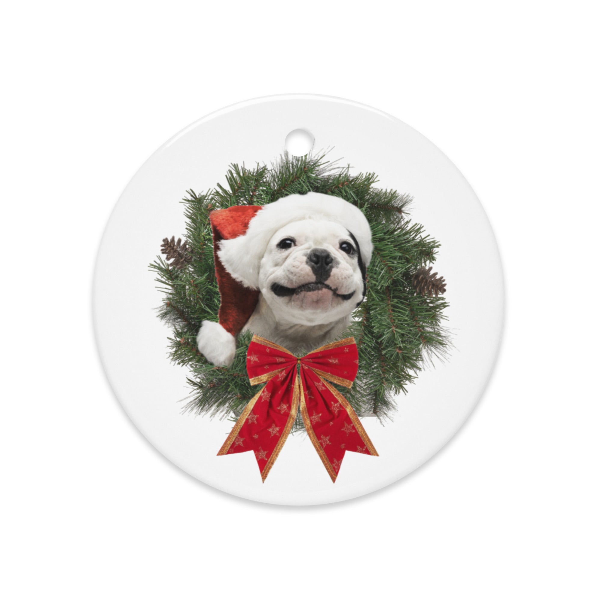 It's a very wonky holiday with Poppy the Frenchie-Pit! Don't forget that all proceeds go toward our rescue partner, Luvable Dog Rescue. Shiny from all angles, these two-sided ornaments bring double the cheer. Great for personal gifting or maxing your seasonal decor, they come in four festive shapes with a high-gloss finish.
